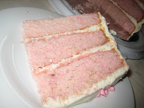 Despite the fact that it is a ginormous cake, what with the three layers, it was not difficult to make. The cream cheese frosting, while not the best frosting to use if you want your cake to look flawless, complemented the flavor of the cake very well. And the cake was delicious. The strawberry flavor was very pronounced. Like the original poster, I used frozen (thawed) strawberries. I also used two colors of food dye - pink and red (Wilton gel) - to make the cake match its name.